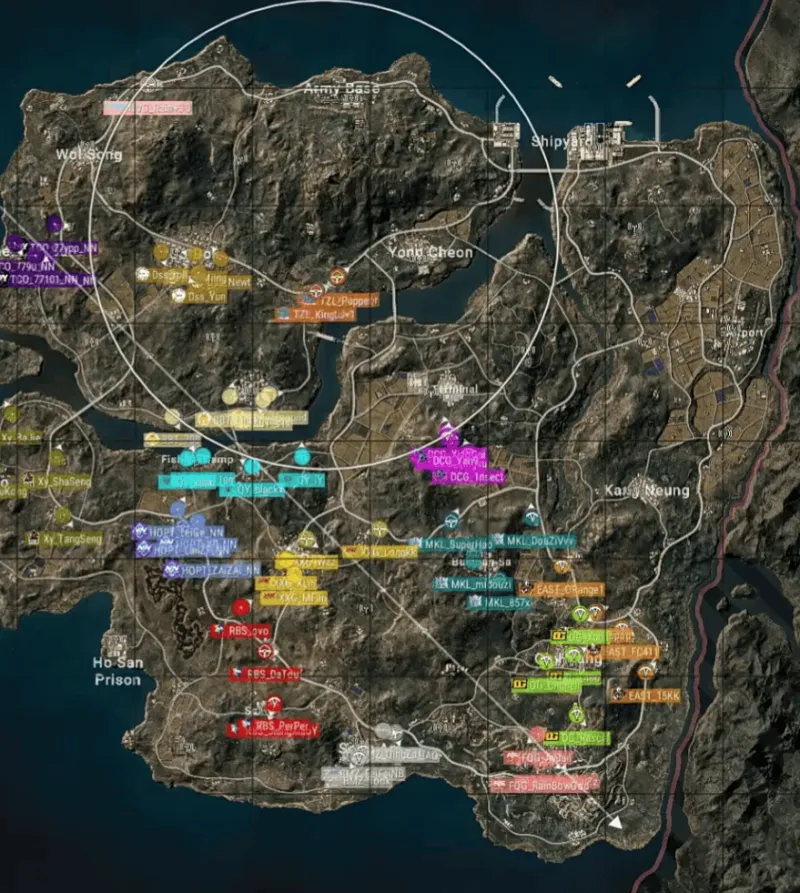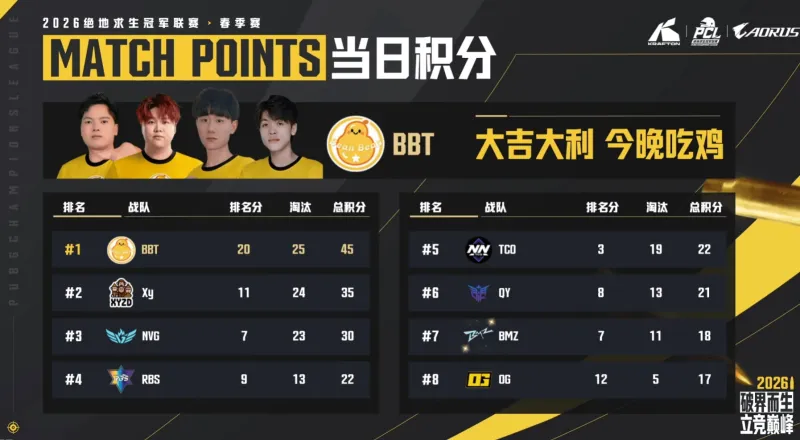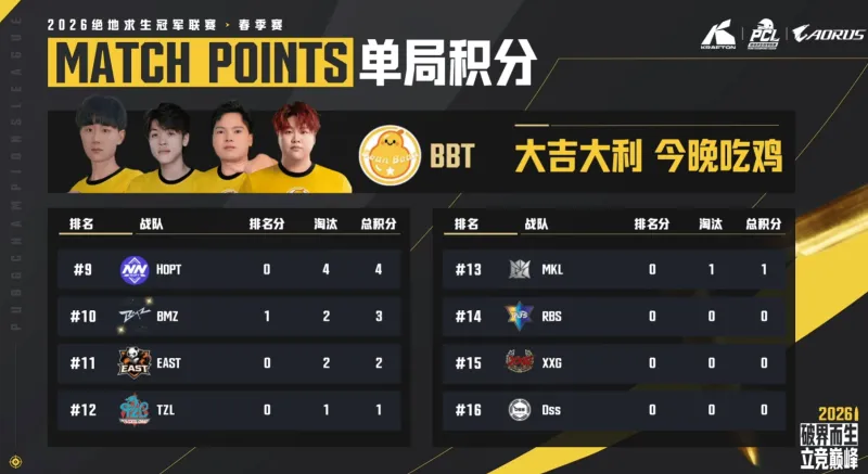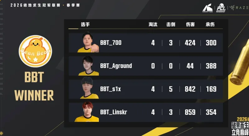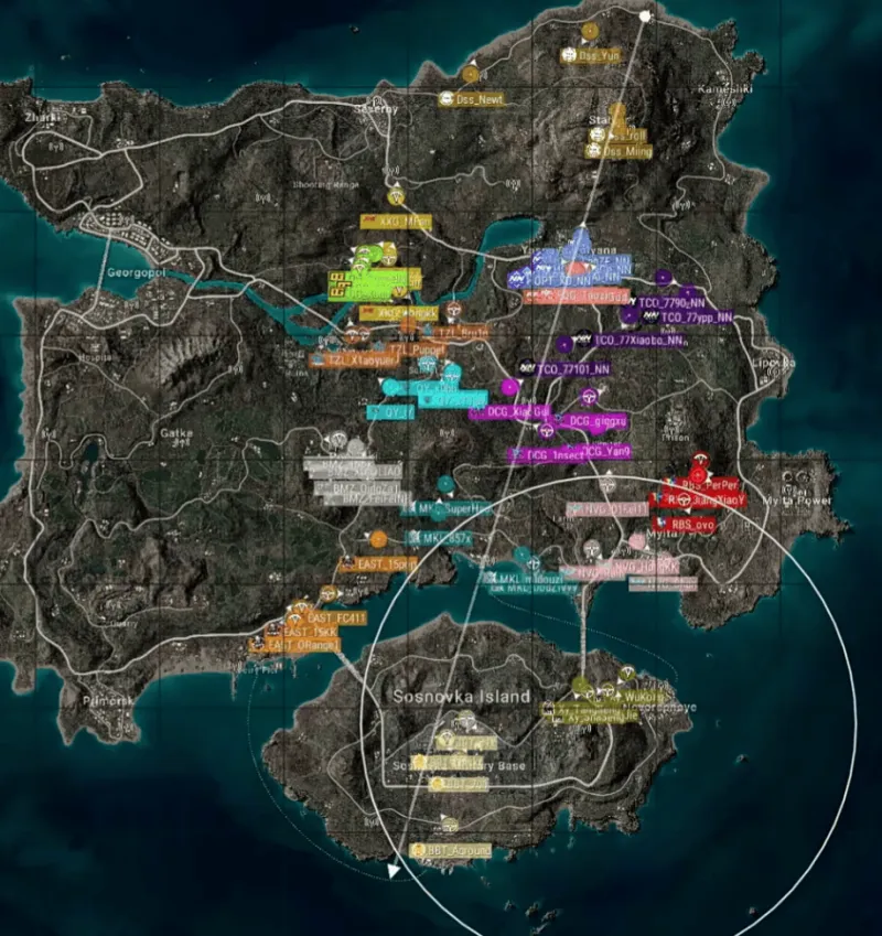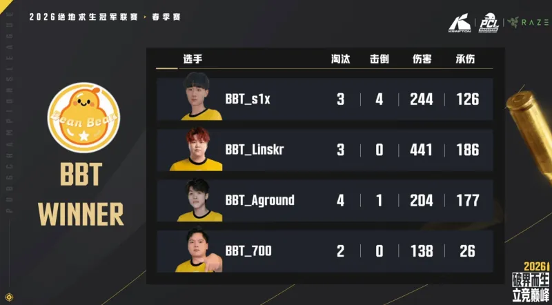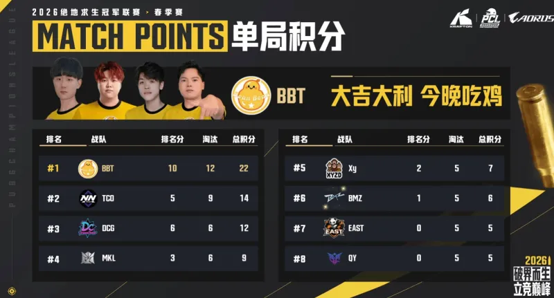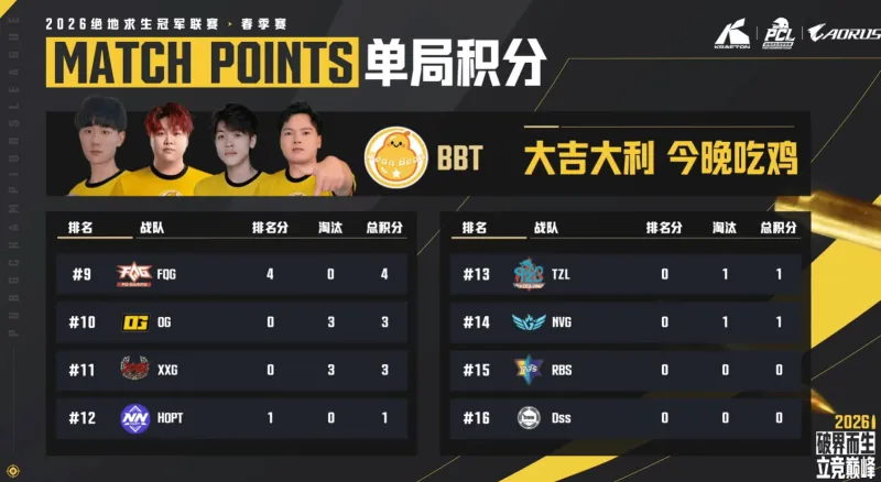 决赛圈,BBT4人满编,OG剩余2人,EAST剩余1人,BBT率先淘汰EAST独狼,而由于梅花桩位于防空洞外,最终BBT选择不进攻防空洞内部,OG两人因为时间来不及打药,最终被蓝圈淘汰,BBT完成吃鸡。
