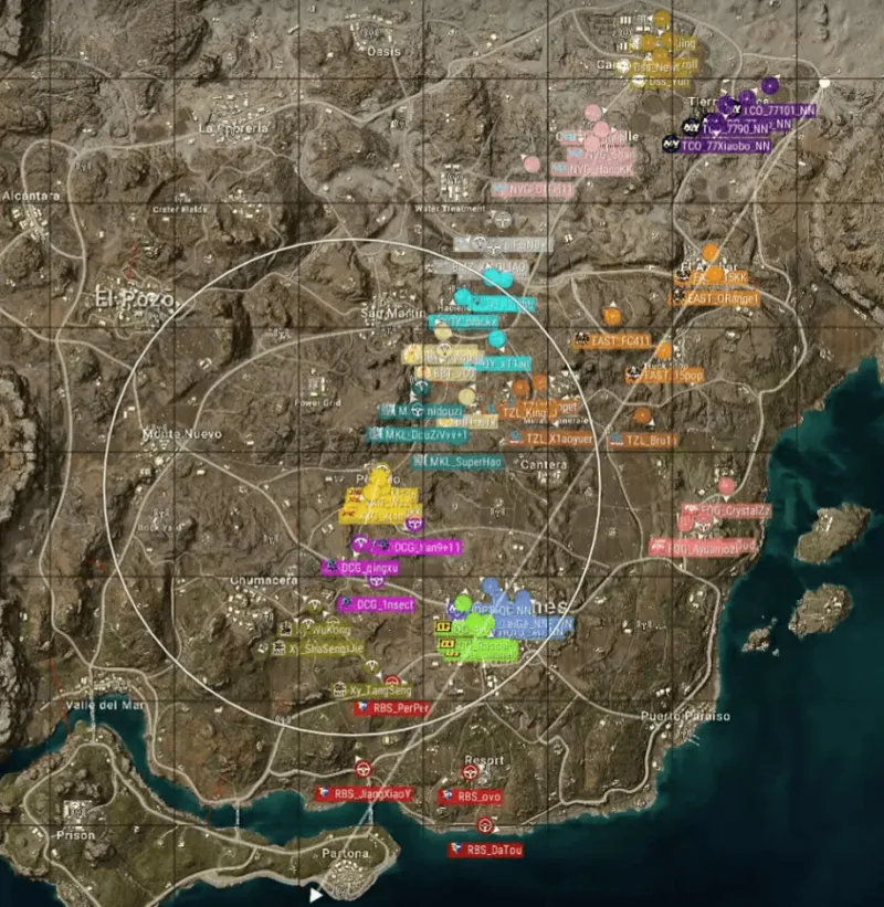 阶段6剩余6队,OG独狼被BMZ淘汰,TCO被XY团灭,BMZ离开长条房野区时与坡下的NVG交火,NVG率先被侧翼枪线夹击后淘汰,BMZ进圈但被打掉1人。